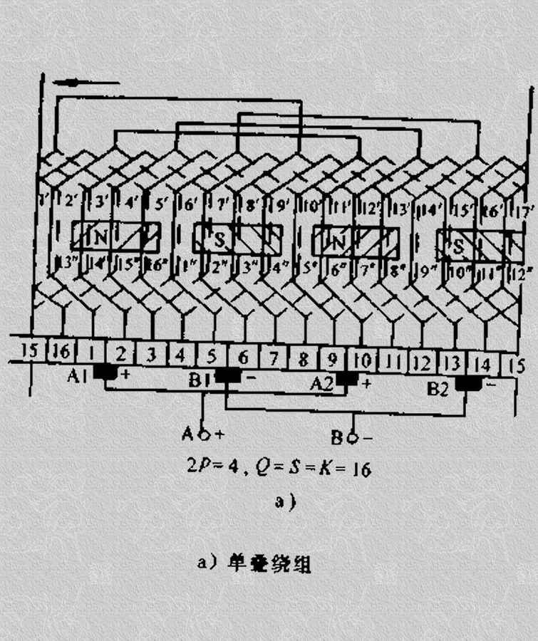 4極電機(jī)的復(fù)波繞組,其有16個線圈元件。它的實質(zhì)相當(dāng)于兩個或兩個以上的單波繞組交疊在一起,并靠電刷并聯(lián)起來工作。它和復(fù)疊繞組一樣也有單閉路和雙閉路兩種。