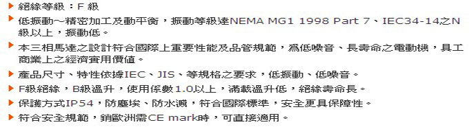 高崎臥式高效率電機軸端攻牙高崎高效率電機高崎電機一直不斷投注與研究開發高效能產品,使用最先進的電腦輔助設計儀器及噪音測試室等設備,借以提升各項產品設計和監測能力等```使得產品具有體積小.重量輕.低噪音.高效率.壽命長等優點,深獲得各界肯定;并用管理現代化.設備自動化來提高生產效率,降低成本,強化國際市場競爭力鋁合金外殼系列馬達馬力:0.25HP-20HP電壓范圍:50HZ220V380V/415V                  60HZ220V380V/415V 絕緣等級:F CLASS    IP55高效率EFF1接線盒可多邊安裝,90度旋轉,CE  UL ISO9001認證。