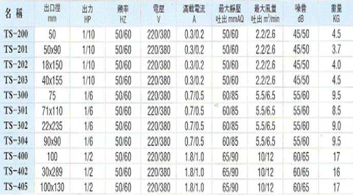 TS201-405鼓風機特性說明: 一般用于塑膠材料片材的擠出、吹塑等相關機械設備上的抽排風,采用鋁合金重力壓鑄外殼,配合離心葉輪及優化參數設計,使各風壓及風流量達到所配置的性能最優,以利使用壽命能完全配合所設計的8---10年! TS系列說明:名稱 出口徑 出力 頻率 電壓 滿載電流 最大靜壓 最大風量 噪音 重量