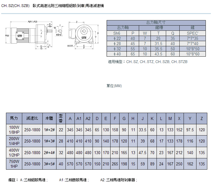 城邦臥式標準/縮框高速比馬達減速機是采用日本三菱的技術設計制造。具有低噪聲,低振動,體積小,重量輕,型號多樣,安裝維護簡單等特點。特性:鋁合金外殼,斜齒輪精密研磨,獨特防水防潮設計、電機 IP55 保護等級、 F 級絕緣、低噪音、長壽命,免維護、現貨供應、服務一流模型代號 TYPES : CH, CV, CHM, CVM, CHD, CVD 馬力 CAPACITY : 100W-3700W減速比RATIO : 3, 5, 10, …1800